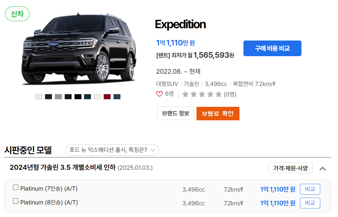 Expedition 모델은 1억 1,270만 원에서 시작하며, 다양한 트림에 따라 가격이 달라질 수 있습니다. 7인승과 8인승 모델 모두 동일한 가격을 가지고 있으며, 옵션 선택에 따라 추가 비용이 발생할 수 있습니다. 공식 가격 비교 웹페이지에서 신차 견적을 확인하며 자신에게 알맞은 옵션 구성을 찾는 것이 중요합니다.
