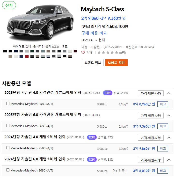- Mercedes-Maybach S580 Night Series 3,982cc, 연비: 8.0㎞/ℓ, 가격: 3억 3,000만 원