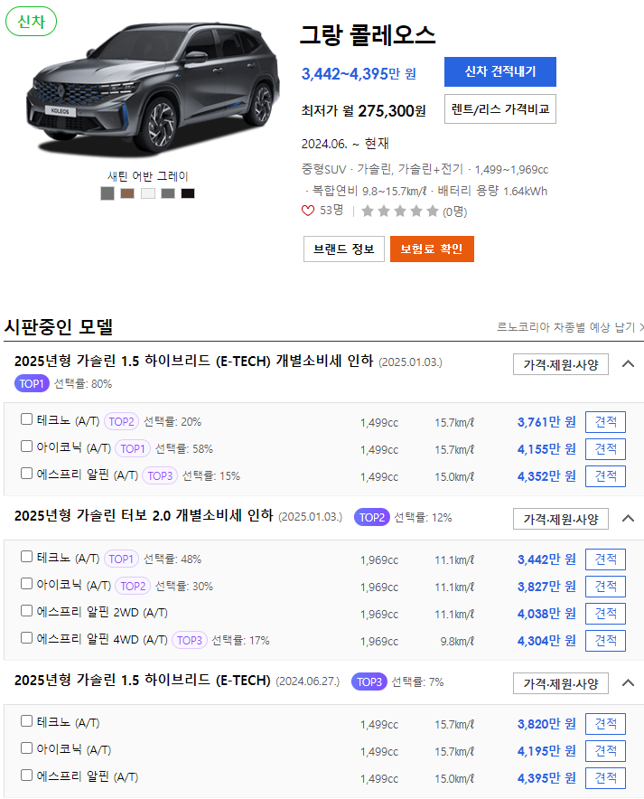 2025년형 그랑콜레오스 하이브리드는 다양한 트림과 가격대로 제공됩니다. 각 트림별 가격 범위는 다음과 같습니다: