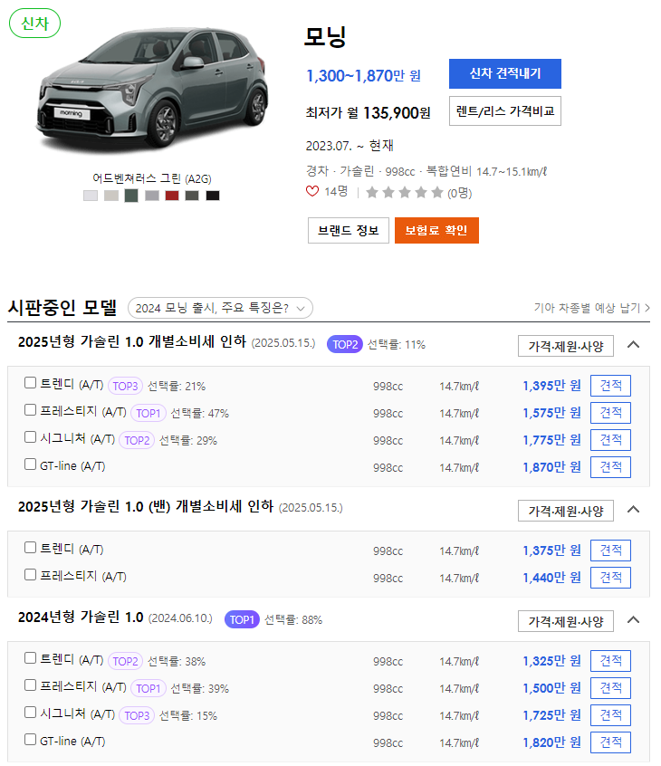 2025 모닝의 가격은 트림과 옵션에 따라 다양하게 설정됩니다. 기본 모델인 트렌디의 경우 1,325만 원부터 시작하며, 상위 모델인 프레스티지는 1,500만 원, 시그니처는 1,725만 원, GT-line은 1,820만 원입니다. 옵션 추가나 특수 색상 선택 시 가격에 변동이 있을 수 있습니다. 따라서, 옵션 구성과 가격대를 비교해보면 나에게 맞는 트림을 찾기 쉬워집니다.