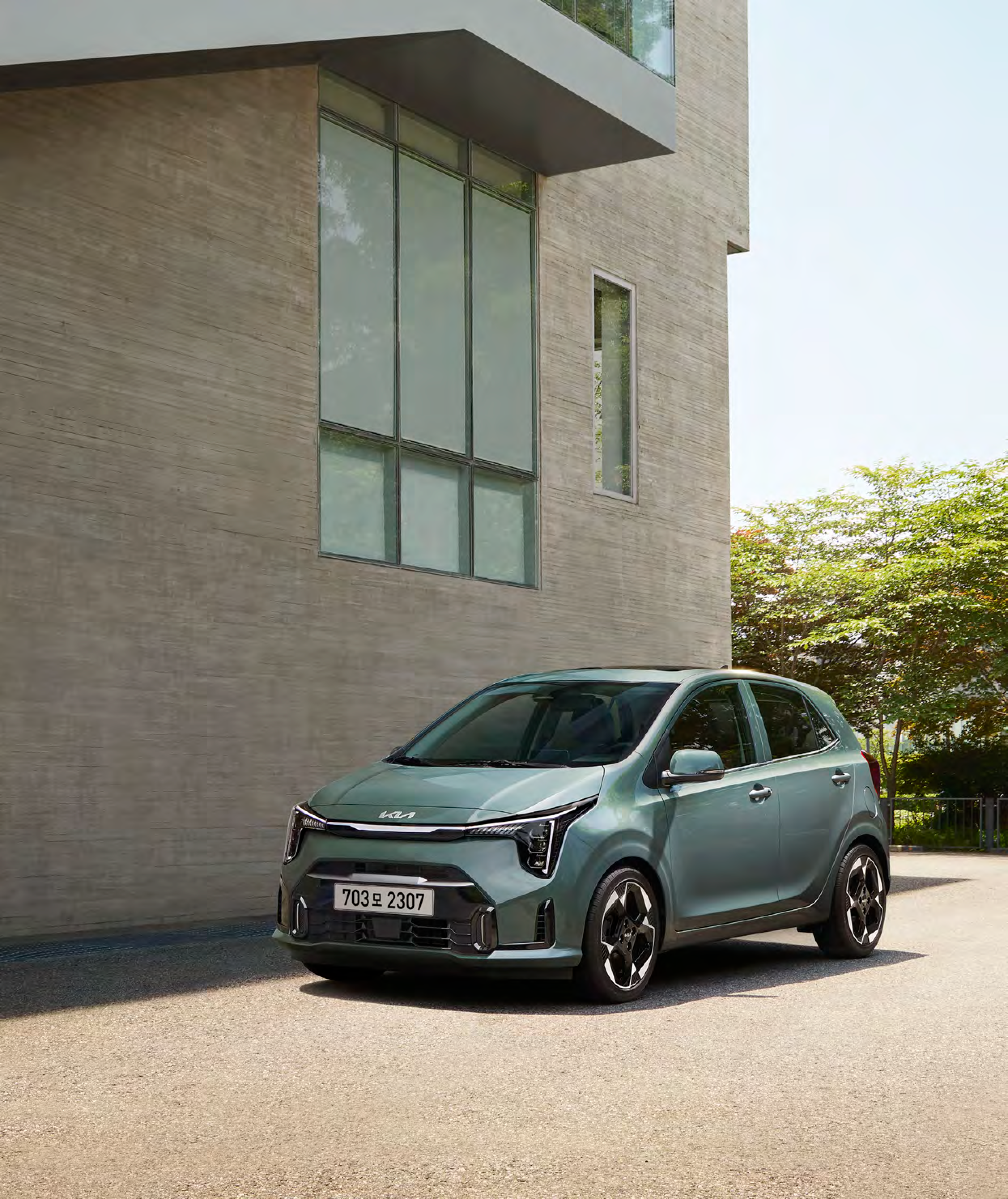 새로운 2025 모닝은 현대적이고 세련된 외관 디자인을 가지고 있습니다. 전면 그릴과 LED 라이트 디자인이 특히 돋보입니다.