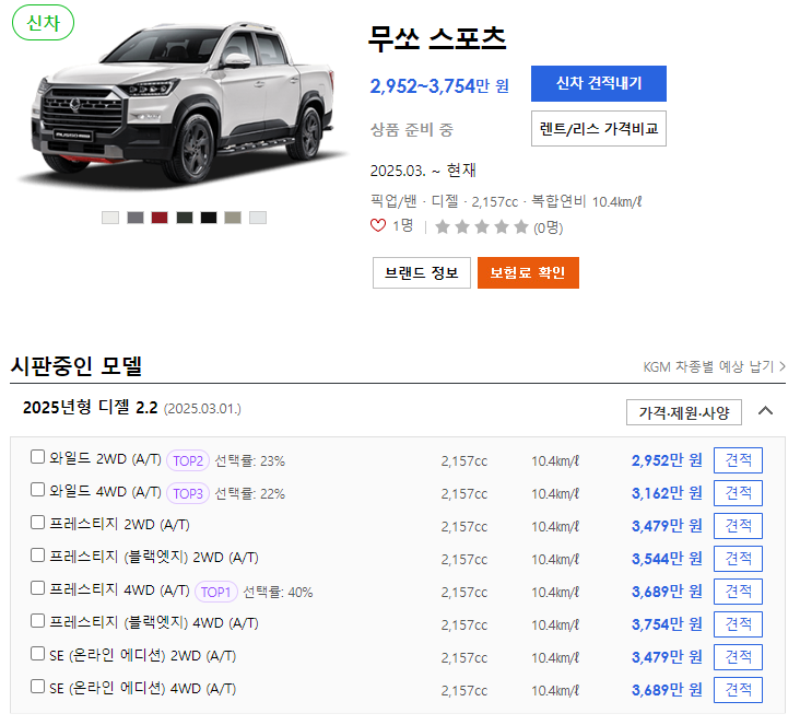 2025 무쏘 스포츠의 가격은 트림에 따라 2,952만 원에서 3,754만 원입니다.
