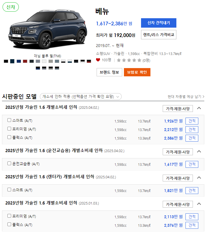 2025 베뉴에 대한 다양한 정보를 통해 가격, 연비, 제원, 유지비 등을 한눈에 확인할 수 있습니다. 해당 차량 구매에 고민 중이시라면 위 정보를 참고해보시길 바랍니다.