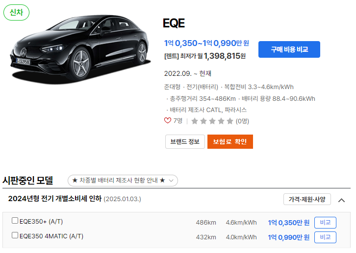 EQE350+는 1억 0,350만 원부터, EQE350 4MATIC은 1억 0,990만 원입니다.