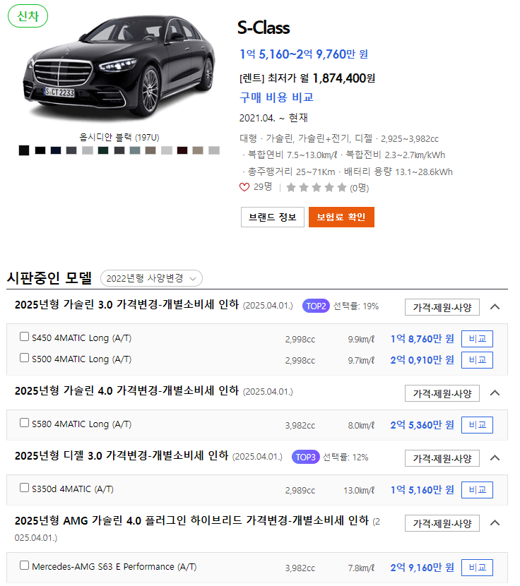 - S500 4MATIC Long (A/T) 2,999cc 9.4㎞/ℓ: 2억 0,630만 원