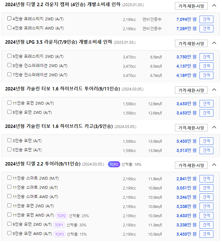 - 9인승 모던 2WD (A/T) : 3,208만 원