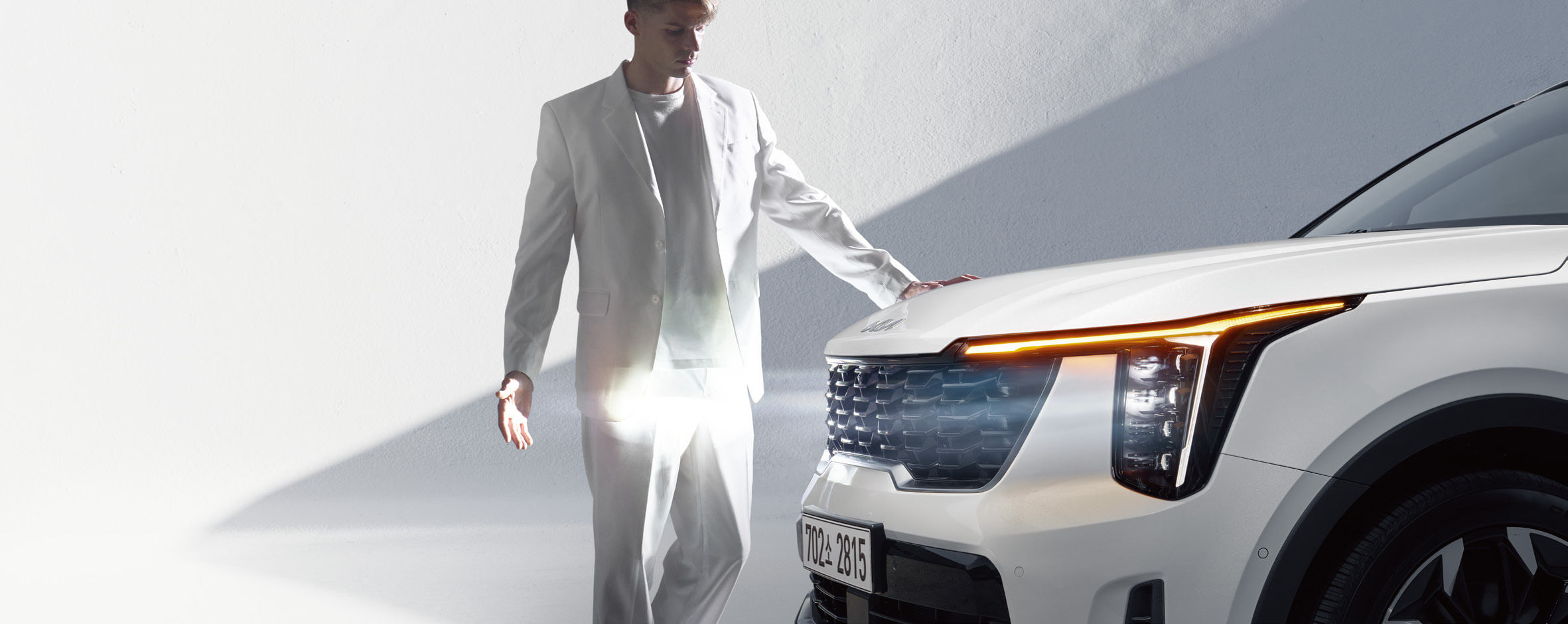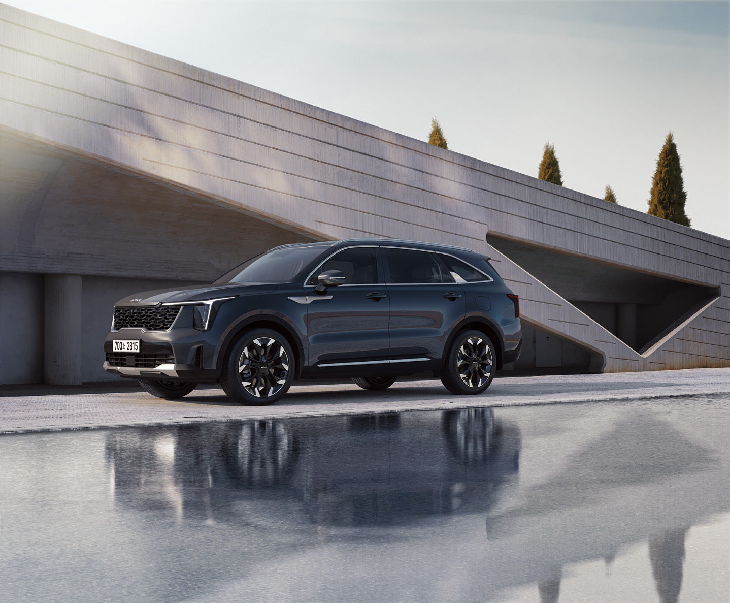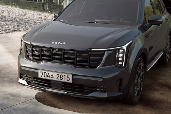 2025 쏘렌토는 현대적이고 강인한 외관을 자랑합니다. 전면 그릴과 날카로운 LED 라이트가 돋보입니다.