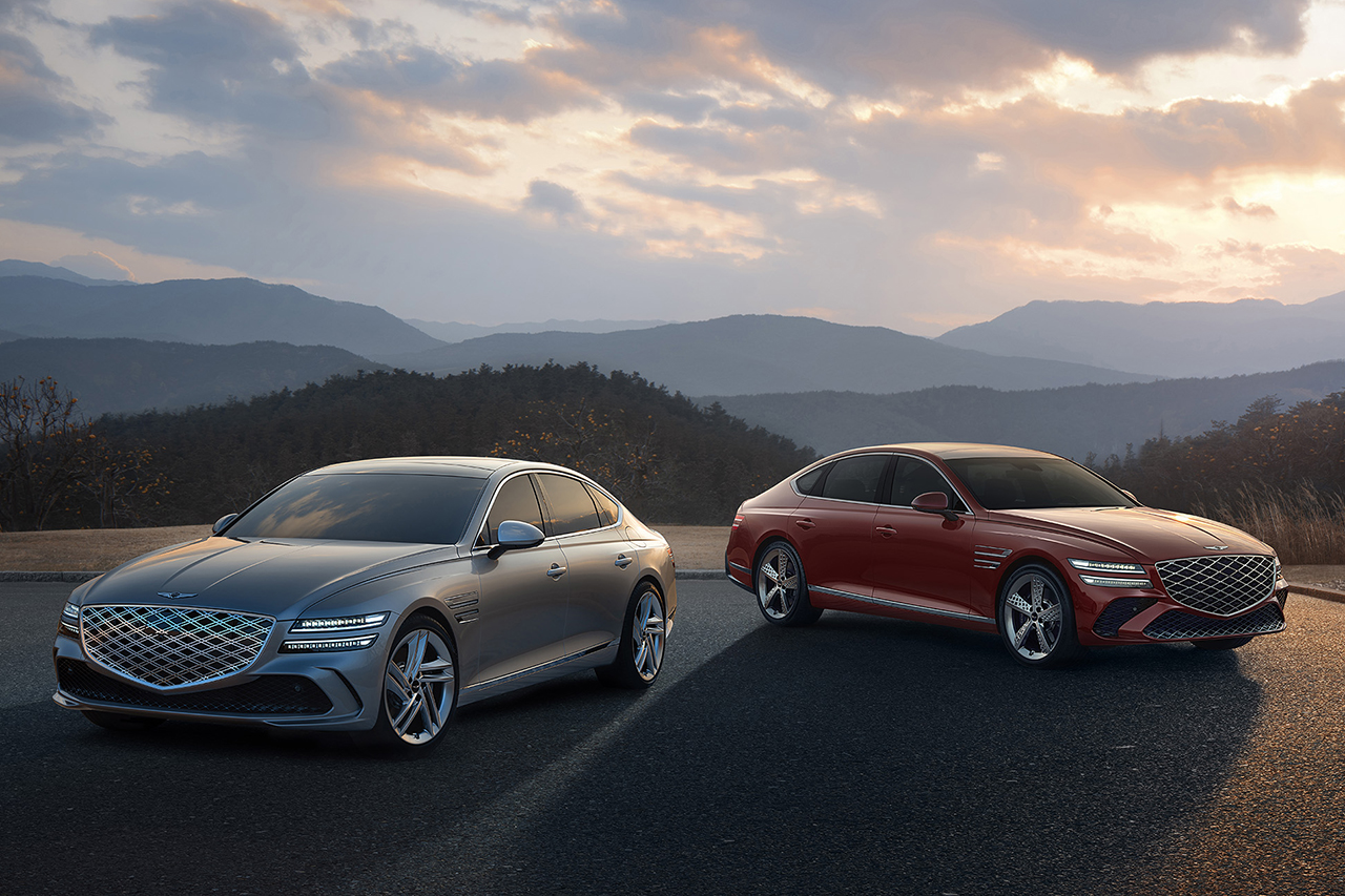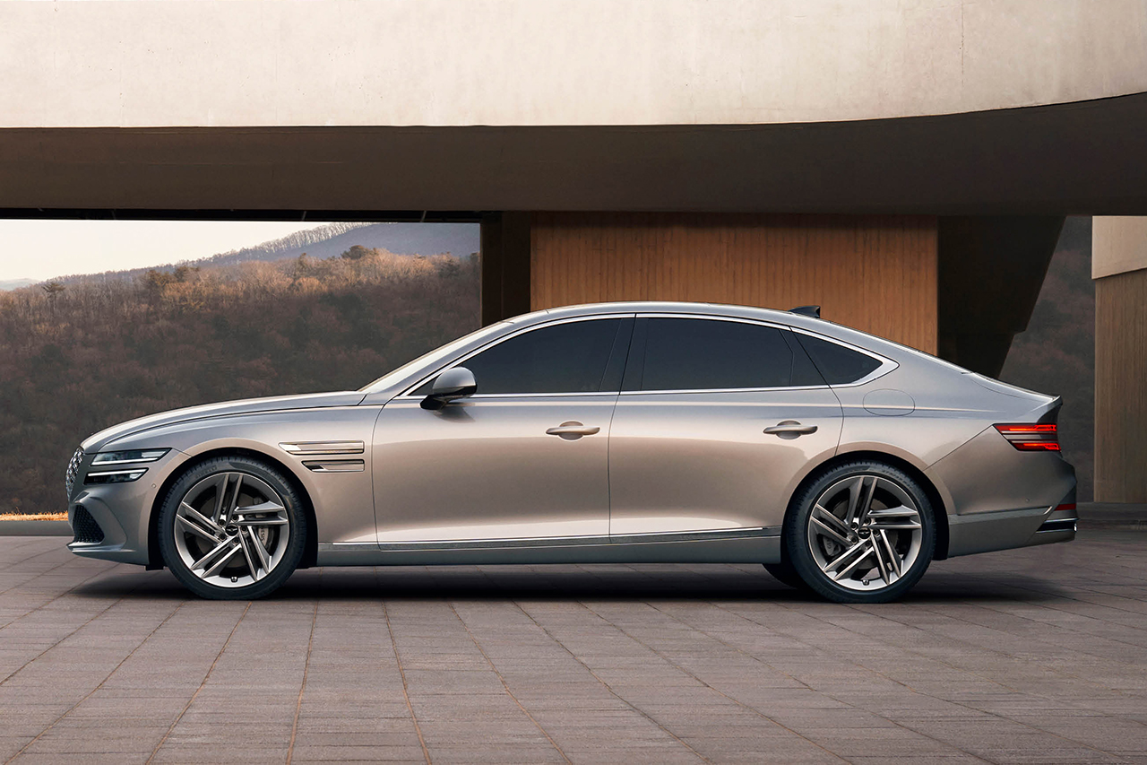 제네시스 G80 전기차의 외관은 현대적이고 세련됨이 특징입니다. 전면의 대형 그릴과 날카로운 헤드램프 디자인이 조화를 이루며, 고급스러운 분위기를 연출합니다.