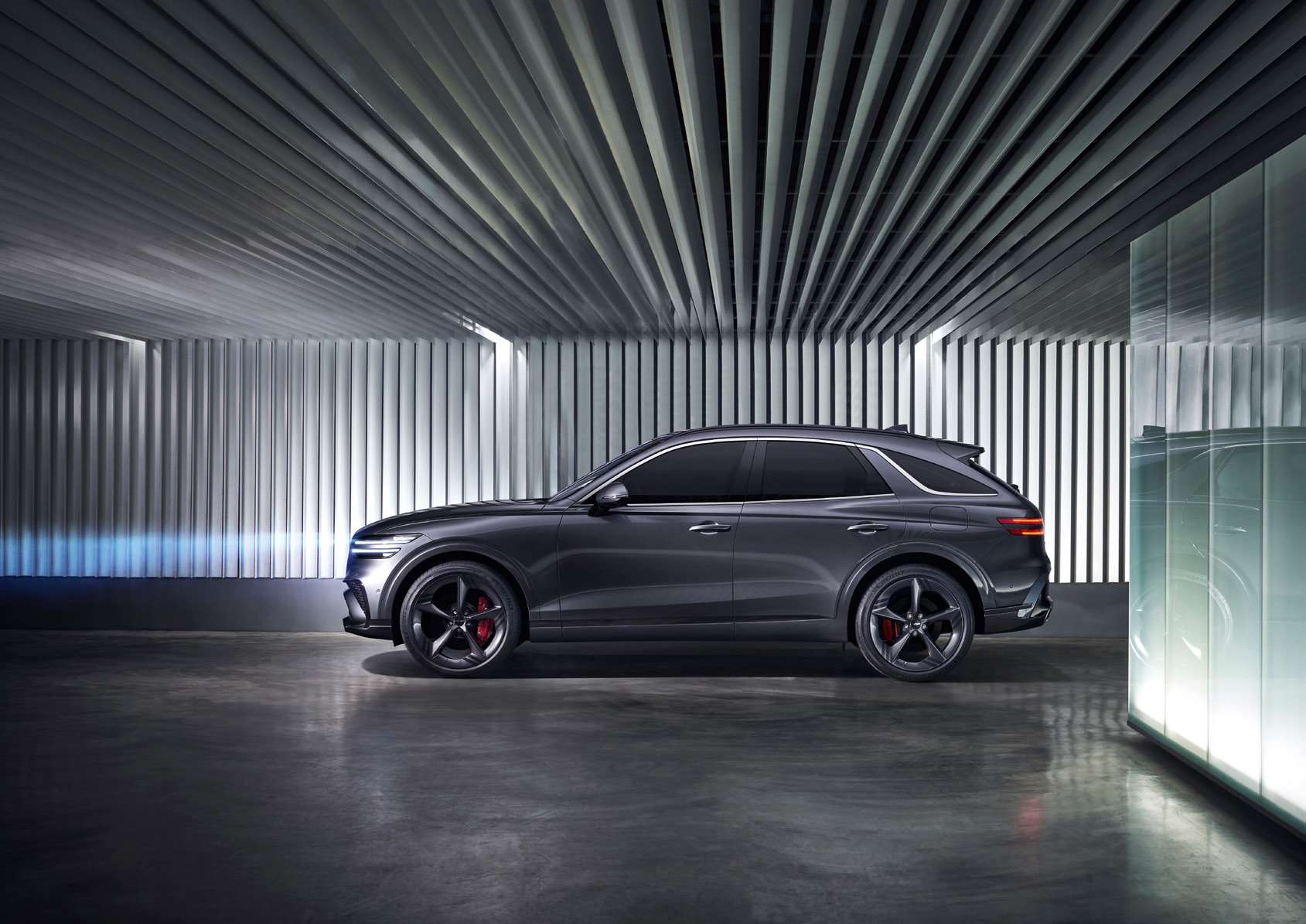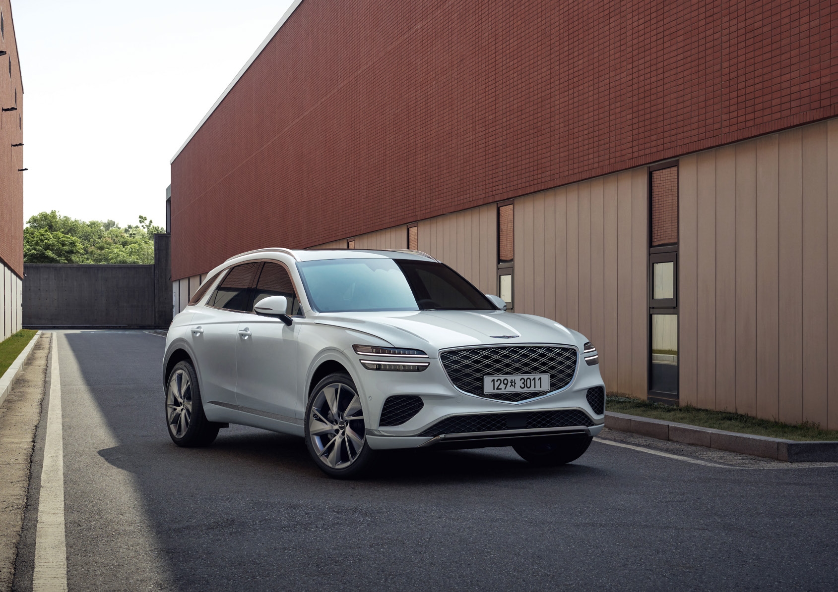 GV70는 독창적인 전면 그릴과 날렵한 차체 라인으로 시선을 사로잡습니다.