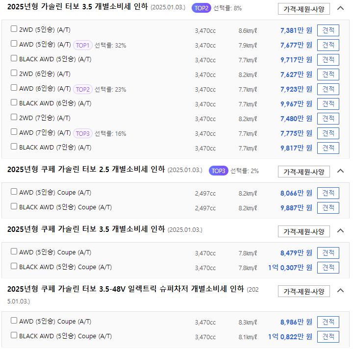• 엔진 타입: 2.5 터보(2,497cc), 3.5 터보(3,470cc)