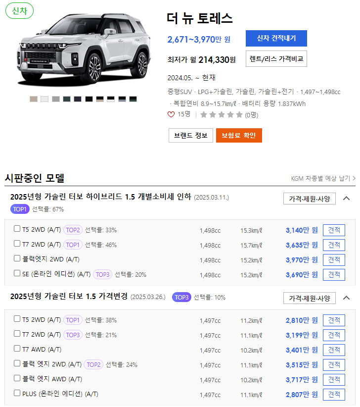 2025 토레스 하이브리드는 가격, 연비, 제원이 탁월하며, 유지비까지 고려했을 때 합리적인 선택입니다. 해당 차량 구매에 고민 중이시라면 위 정보를 참고해보시길 바랍니다.