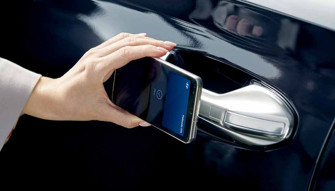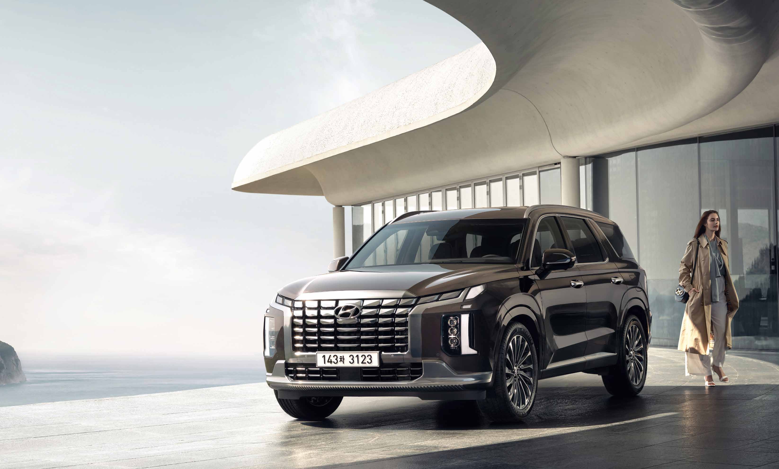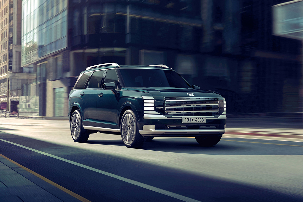 팰리세이드는 현대적이고 강력한 외관을 갖추고 있으며, 전면 그릴과 LED 헤드램프가 돋보입니다.