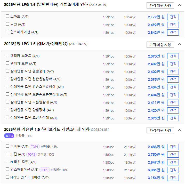 - 2026년형 LPG 1.6 (일반판매용)