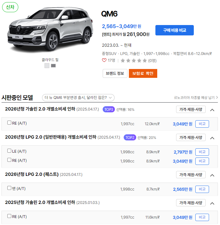 2026 QM6는 가격, 연비, 제원에서 소비자에게 다양한 매력을 제공합니다. 유지비용 측면까지 고려하면 실속 있는 선택이 될 수 있습니다. 해당 차량 구매에 고민 중이시라면 위 정보를 참고해보시길 바랍니다.